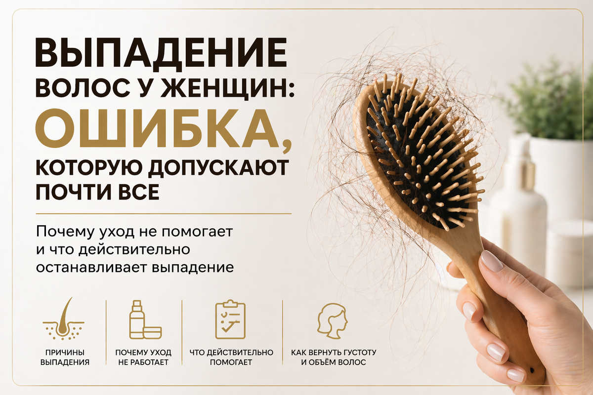 И почти каждая - делает одну и ту же ошибку. Когда волосы начинают выпадать, хочется быстро это остановить. И включается привычный сценарий: Всё это выглядит логично. Ведь если проблема с волосами - значит, их нужно лечить. Но именно здесь и происходит главная подмена. Волосы - это не причина.