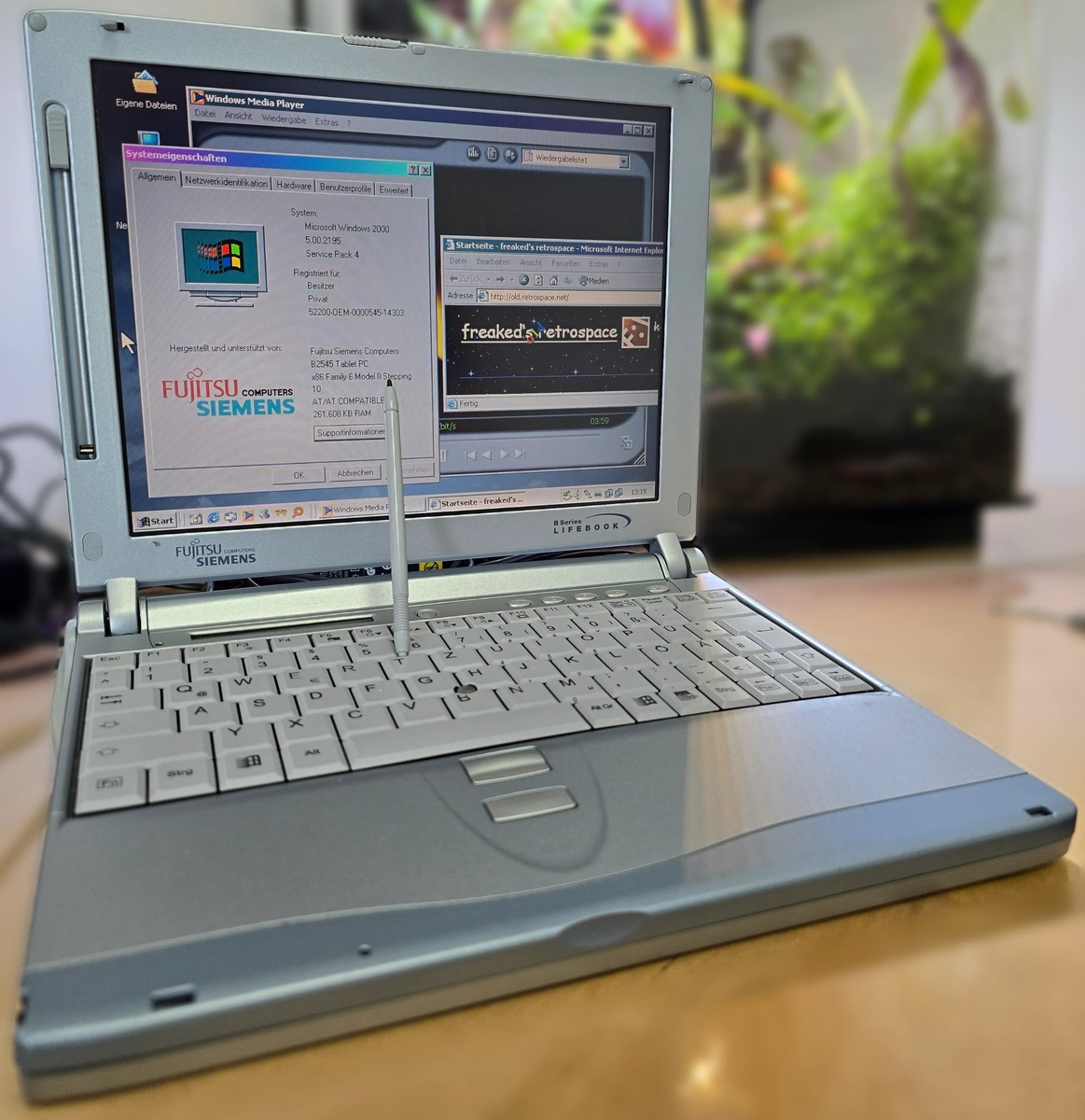 Какой классный Fujitsu-Siemens B2545 с сенсорным дисплеем. Непривычно для 2001 года и Windows 2000. До Microsoft Tablet PC ещё минимум год. Внутри Pentium 3, потому что Pentium 4 в таком малыше бы просто раскалился до красна.