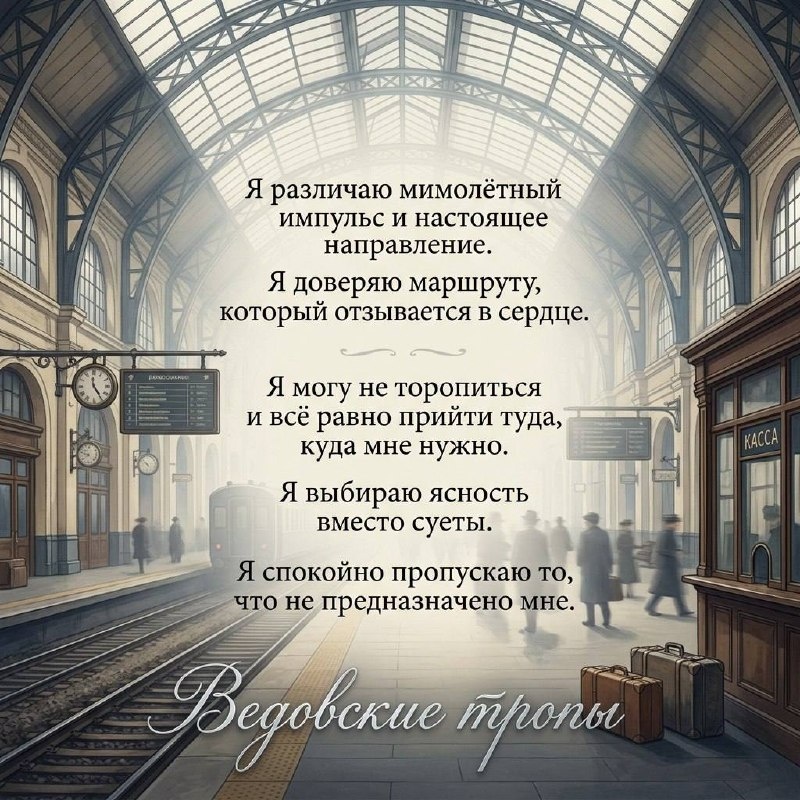 : Сегодняшний день похож на красивый старый вокзал. Высокие окна, прохладный свет, эхо шагов, табло с меняющимися направлениями, голоса вдалеке, поезда, которые приходят и уходят. Здесь всё находится в движении, всё зовёт, всё предлагает маршрут. Это не тихое спокойное пространство покоя, где можно остаться навсегде. Это пространство выбора, здесь нужно принять решение и при этом не сесть в чужой поезд, во всеобщей суете не бежать за толпой, а найти своё направление. Знаки окружают нас: объявления, пересадки, случайные фразы, короткие встречи, мысли, которые вспыхивают и исчезают, словно огни на путях. И потому главная задача — не потеряться в потоке, а услышать, куда тебе действительно нужно. Это день, когда можно многое заметить. Но не всё нужно брать с собой. Иногда мудрость в том, чтобы просто остаться на своей платформе и не садиться в поезд, призывно открывший двери, который при этом не повезёт тебя туда, где ждёт твоя судьба. Телесный ключ этого дня — расслабить пл