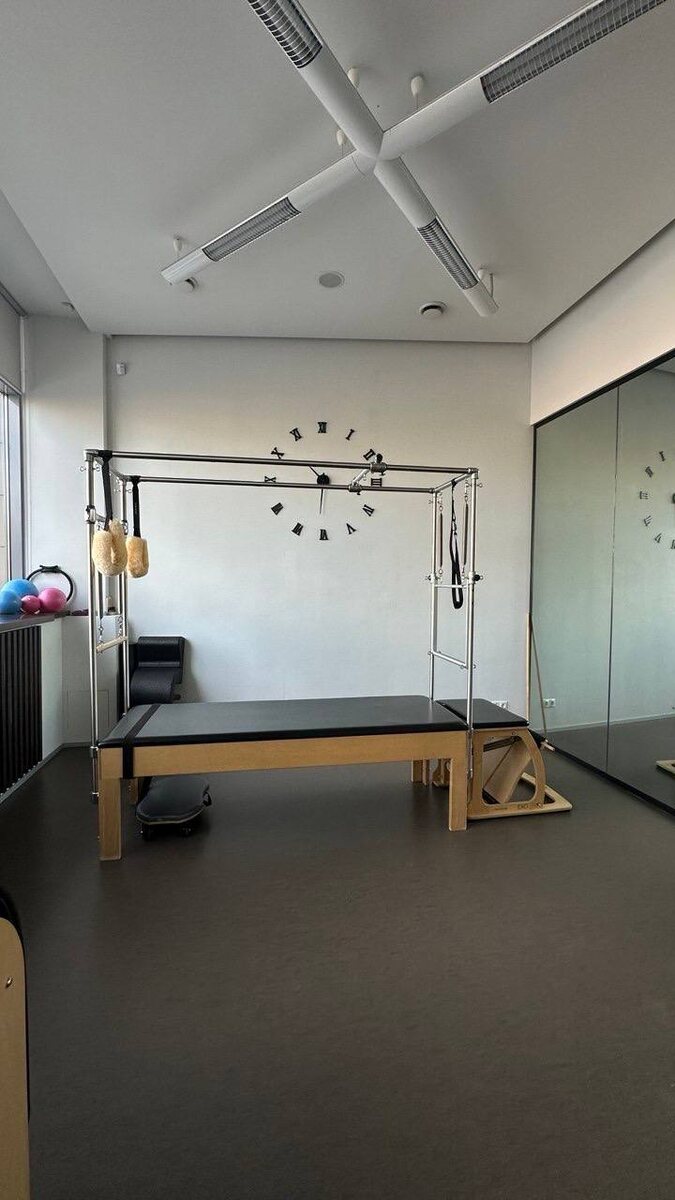 Реальные фото помещения. Идея аморфных узоров на стене как фон. Римские цифры часов заменить на четыре спортивные фигуры людей. Под часами расположить архивные ч/б фото Джозефа Пилатеса. Деревянный стеллаж для хранения оборудования. Все загружаем в нейросеть и на последнем фото — результат. Концепцию сделала за несколько минут 👌
