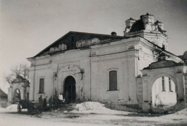 Фотография, примерно декабрь 1941 года, село Мшага Воскресенская, Шимский район, Новгородская область во время фашистской оккупации. Утраченная Церковь Воскресения Христова.