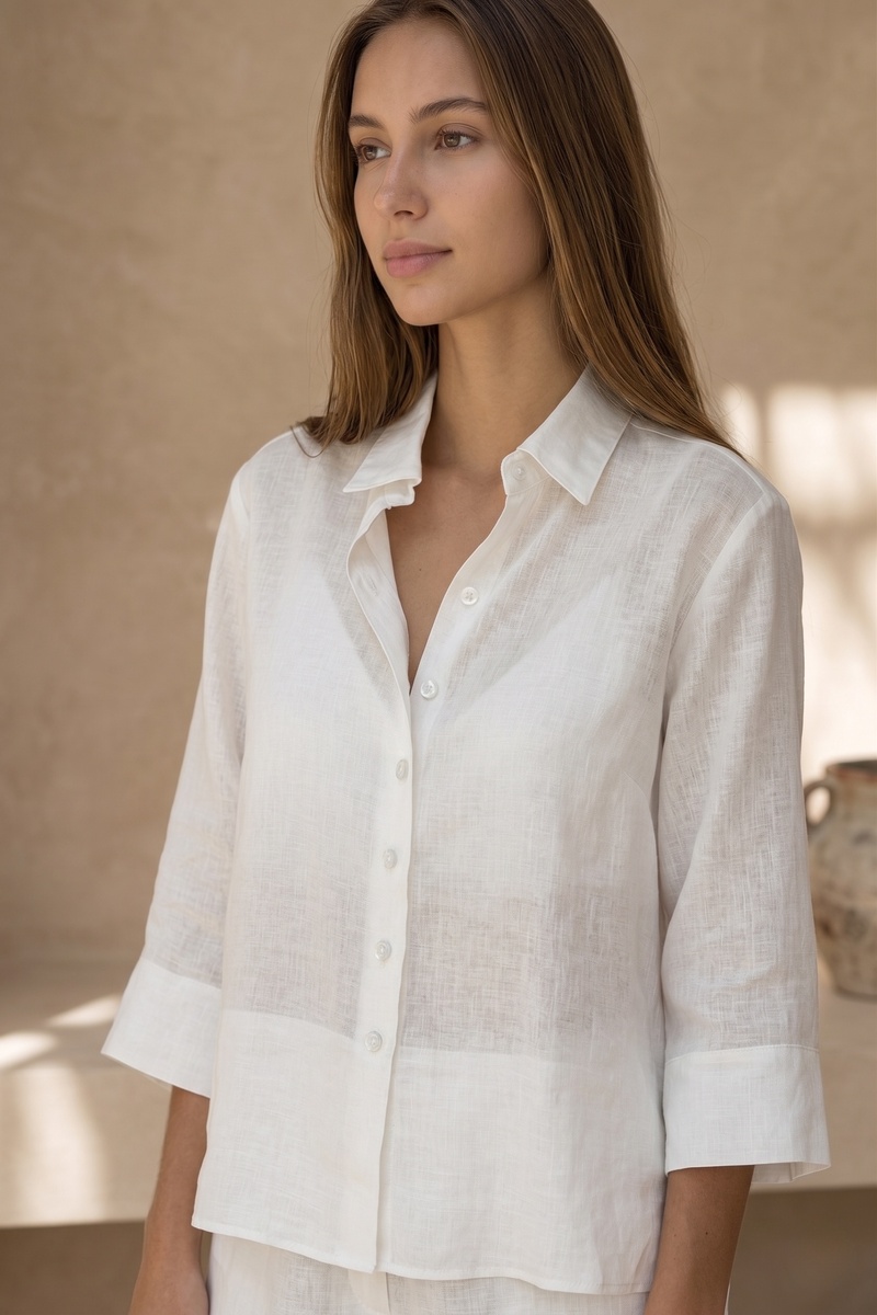 Начнём с самого важного – материала. В жару тело регулирует температуру, и если волокна закрыты наглухо, комфорт улетучивается за минуту. Посмотрите на белую рубашку из натурального льна: чёткая текстура плетения видна даже на снимке, но именно она создаёт воздушную прослойку между кожей и одеждой.