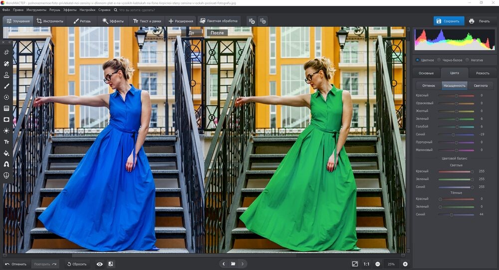 Инструмент «Замена цвета» способен изменить цвет объекта или области на фотографии на новый без потери детализации текстур за счёт того, что он использует режимы наложения при смешивании нового цвета с исходным. Инструмент использует четыре режима наложения: