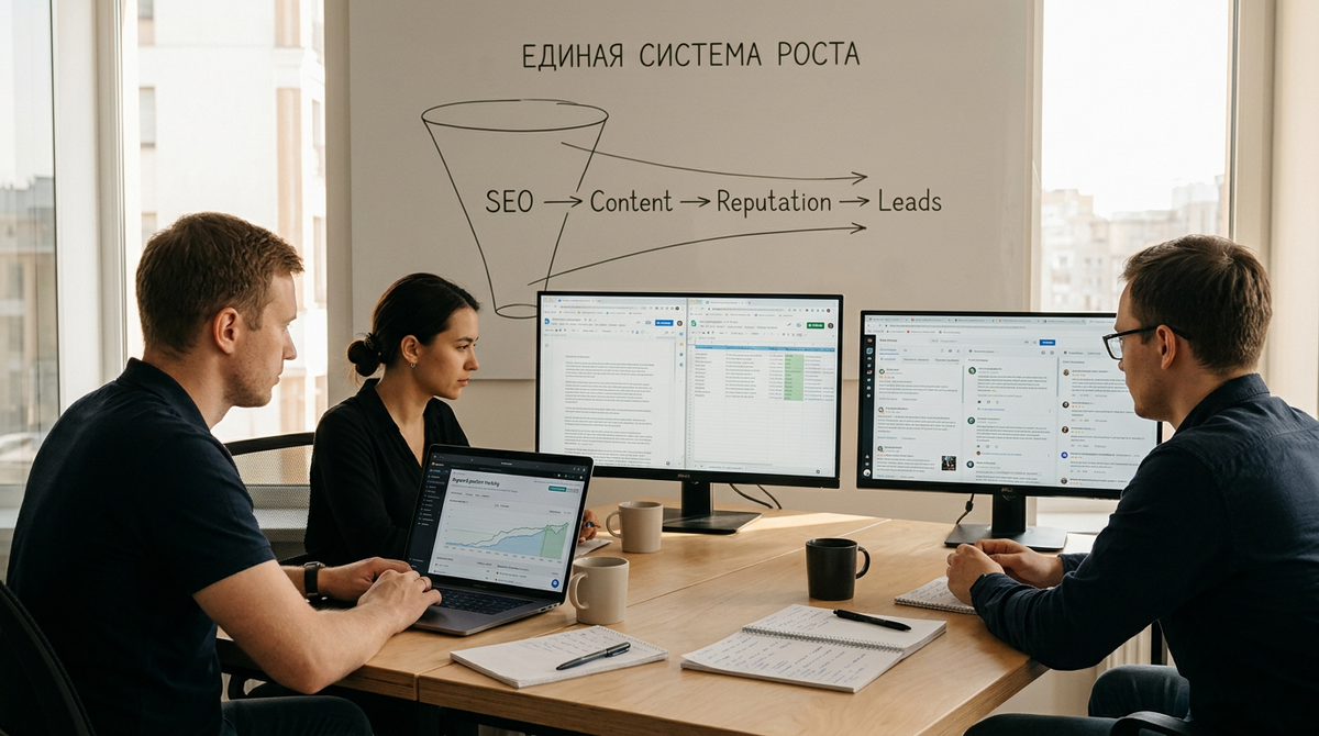 Так формируется цикл: SEO приводит целевую аудиторию, контент превращает её в заявки, а SERM укрепляет доверие и улучшает сигналы, которые, в свою очередь, поддерживают SEO.