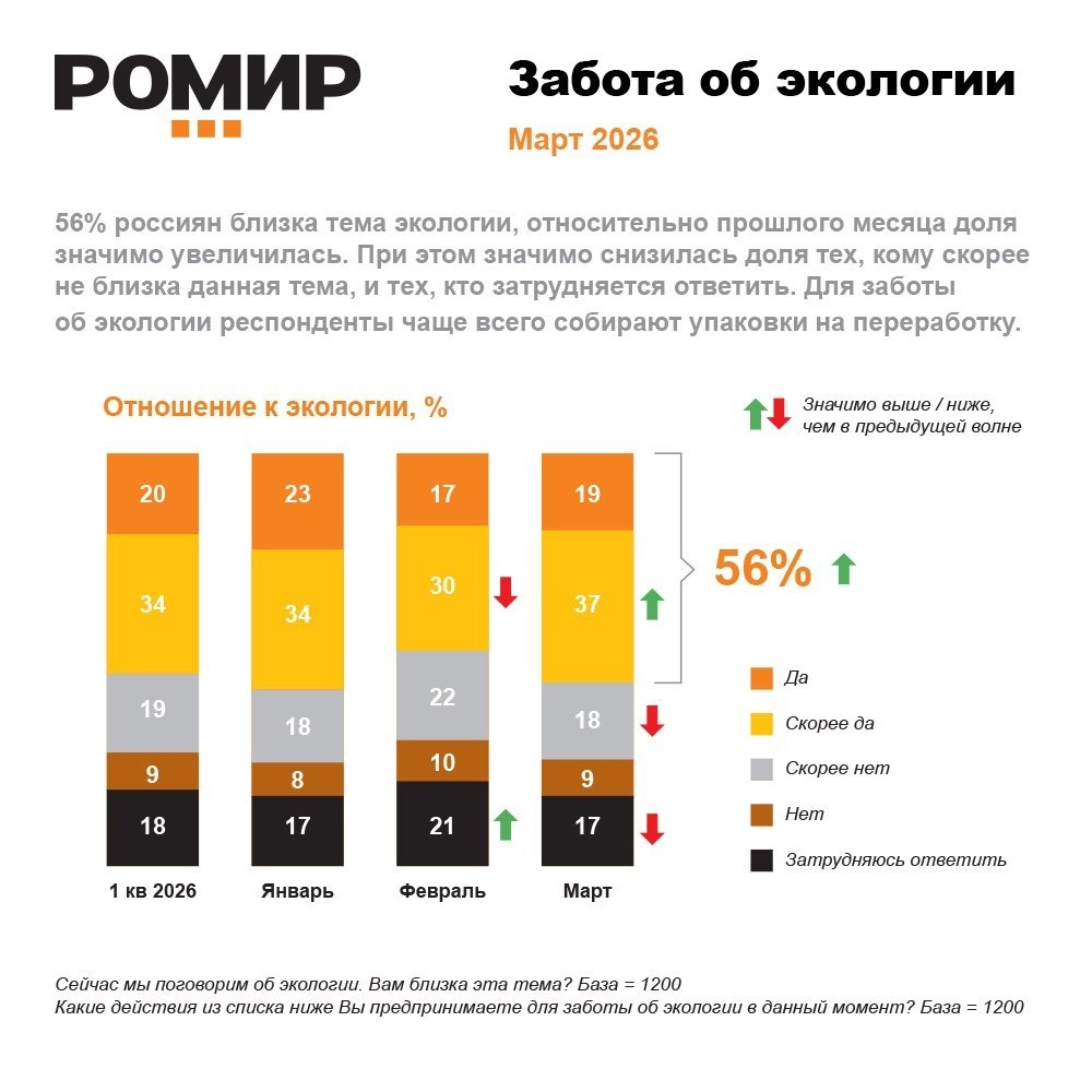 Тема заботы о природе сегодня близка большинству жителей страны. По данным РОМИР, в марте 2026 года об этом заявили 56% россиян, что на 9 п.п. больше, чем месяцем ранее. Среди самых распространенных практик: – сбор упаковки на переработку – сортировка отходов – сокращение пищевых потерь – выбор более натуральных продуктов – снижение использования пластика Экологичное поведение все чаще воспринимается как часть заботы о собственном здоровье, комфорте и качестве жизни. Подписывайтесь на РОМИР Читайте нас в MAX | Дзен |ВКонтакте Думайте вместе с Андреем Милёхиным