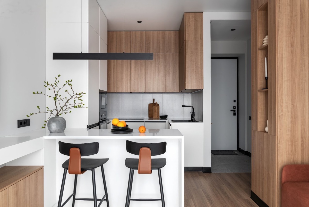 Идея этого проекта — минималистичное пространство, наполненное уютом и творческой энергией, без однообразия. Посмотрим, как удалось ее воплотить. Объект: евродвушка 39 кв.м в ЖК «Павелецкая Сити», г. Москва (потолки 2,87 м) Автор проекта: дизайнер-архитектор Иван Чернечков, автор фото Мария Иринархова Бюджет: 4,39 млн рублей Квартира была сдана застройщиком с отделкой white box. Планировочное решение имело один существенный минус — прямой обзор на диван в гостиной при входе. Вопрос решили установкой шкафа, который взял на себя функцию зонирования прихожей и гостиной. Гарнитур изготовили на заказ, фартук выложили керамической плиткой. «Верхние шкафы с деревянными фасадами продлены до потолка — такой подход визуально расширяет пространство и вытягивает пространство наверх, — поясняет дизайнер. — Белые нижние шкафы с черными ручками придают интерьеру графичность». Обеденную зону реализовали в виде полубарной стойки, которую «продлили» в гостиную, тем самым объединив эти два пространства п