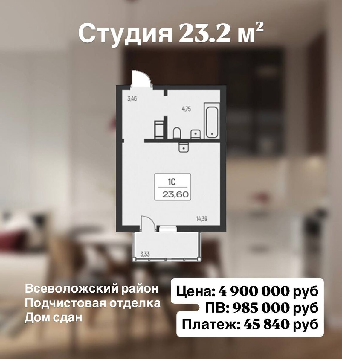 📍Всеволожский район Ⓜ️ Ладожская — 15 мин транспортом С предчистовой отделкой: • цена — 4 900 000 ₽ • ПВ — 985 000 ₽ • платеж — 45 840 ₽/мес. С ремонтом под ключ: • цена — 5 290 300 ₽ • ПВ — 1 062 000 ₽ • платеж — 49 510 ₽/мес. О ЖК: В жилом квартале предложено множество планировочных решений: в наличии квартиры как классического типа, так и европланировки. В квартирах предусмотрены кухни-гостиные, мастер-спальни и гардеробные. Квартиры сдаются с предчистовой отделкой и высотой потолков 2,72 метра. На территории жилого комплекса запроектированы школа и детские сады, современные детские и спортивные площадки, места для отдыха и пешеходный бульвар. Авторский ландшафтный дизайн предполагает высадку деревьев и кустарников различных видов. Внутренние дворы закрыты от машин. Для владельцев автомобилей на территории квартала будут построены многоуровневые парковки. На первых этажах жилого квартала расположены коммерческие помещения. Проект возводится в развитом, тихом районе со всей со