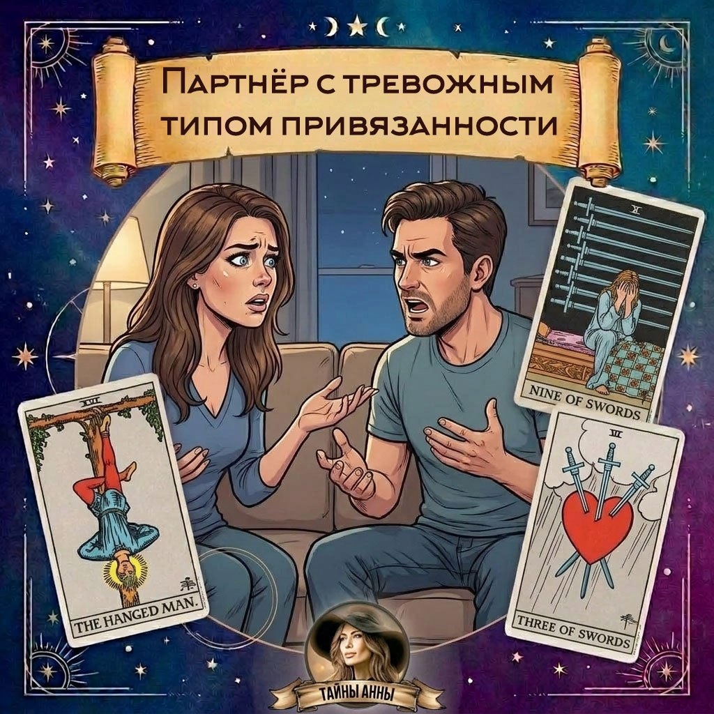 Ко мне регулярно приходят запросы на расклады от партнёров «тревожников» (как правило, мужчин) «Она меня раздражает своими вопросами, постоянно меня проверяет, постоянно задаёт глупые вопросы. Я устал отвечать одно и то же и что-то доказывать!». Да... в таких случаях я стараюсь не ударяться в мантику (предсказание), а пытаюсь открыть кверенту глаза на происходящее... Что это вообще такое? Тревожный тип привязанности — это способ человека выстраивать отношения, сформированный чаще всего в детстве. Суть в том, что ребёнок усваивает, что любовь может исчезнуть в любой момент, без объяснений и предупреждений. Он вырастает и всю жизнь проверяет: а я ещё нужен? а меня ещё любят? а я ничего не сломал? И вот эти проверки выражаются во вполне конкретных паттернах, которые партнёр считывает как недоверие, давление, контроль, романтический инфантилизм. «Прости, что снова беспокою, но...» — звучит как вежливость, но под этим скрывается страх быть обузой. Человек заранее извиняется за саму свою