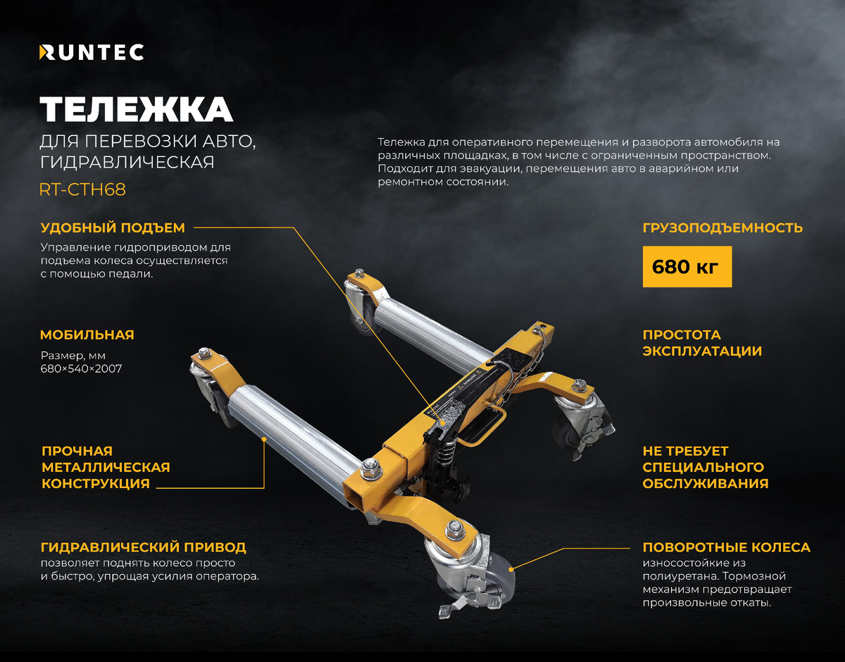 RUNTEC представляет — гидравлическую тележку RT-CTH68, предназначенную для перемещения и маневрирования автомобилей в аварийном или ремонтном состоянии на территории автосервиса, стоянки и других площадках, включая ограниченные пространства. Отличительные особенности: Тележки позволяют работать без привлечения спецтехники, сократить время обслуживания — не нужно заводить двигатель для перестановки авто, а также снизить риск повреждения кузова при буксировке. Важно: для безопасного перемещения автомобиля необходимо использовать не менее двух тележек одновременно — это обеспечит устойчивость и контроль над автомобилем в процессе перемещения.