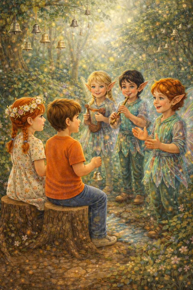 Они оказались в лесу, где всё звенело. С веток свисали маленькие серебряные колокольчики, и каждый лист на деревьях издавал тихий звук, когда его касался ветер. По земле бежали прозрачные ручьи, и они тоже пели — каждый свою мелодию.