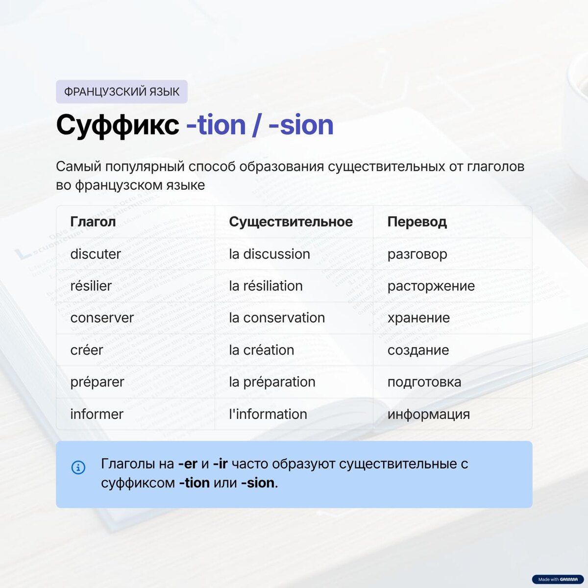 Во французском есть чёткие суффиксы, которые превращают глаголы в существительные. Выучите их один раз — и сможете «добывать» новые слова десятками, даже не заглядывая в словарь.