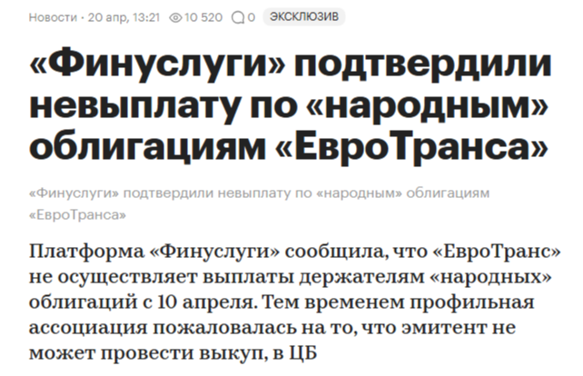 Пришли новости по Евротрансу. Сегодня Финуслуги Мосбиржи сообщили, что Евротранс не исполняет обязательства по выкупу размещенных там народных облигаций, они не исполняются с 10 апреля, о чем площадка поставила в известность Центробанк и направила эмитенту требование об исполнении обязательств.