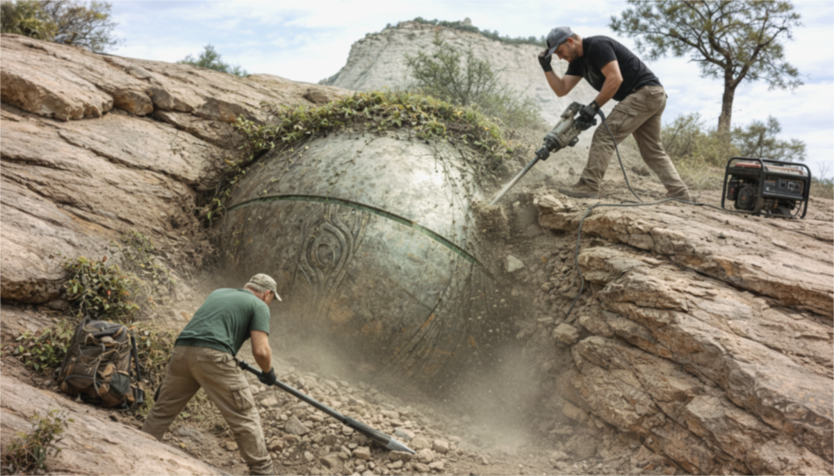 В 2018 году группа спелеологов проводила исследования скальных утесов в одном из живописных и малоизученных районов России — предположительно, в горных массивах Урала или в районах Южной Сибири, известных своими многочисленными пещерами и скальными образованиями. Целью экспедиции было выявление новых подземных полостей и изучение геологических особенностей местности. В ходе работ исследователи обнаружили не очередную пещеру, а загадочный объект, явно скрывавшийся от человеческих глаз на протяжении долгого времени. Им оказалась огромная металлическая сфера, почти полностью вросшая в скальную породу. Поверхность сферы украшали чёткие гравировки, напоминающие стилизованные изображения растительности — травы и цветов, выполненные с поразительной детализацией. Спелеологи приступили к осторожному высвобождению находки, постепенно разрушая окружающую скалу с помощью отбойных молотков. О своей необычной находке они не стали сразу сообщать научному сообществу: вместо этого исследователи разбили