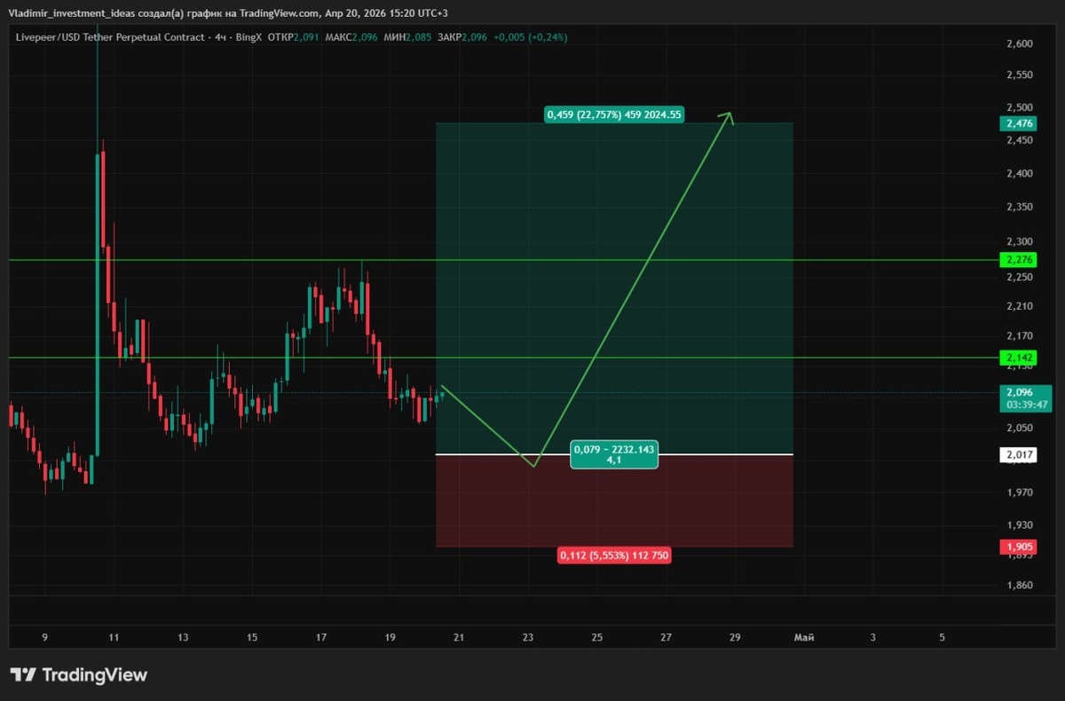 Почему лимитка: цена 2,096 — середина диапазона 2,00–2,30. Вход с текущих = стоп -9%, RR слабый. От 2,017 (ключевая поддержка) стоп -5,7%, RR ≈ 4R. Логика: - 11 апр. импульс до 2,45 — след крупного покупателя, ретест максимума напрашивается. - После импульса — боковик, не слом. Накопление. - 2,017 уже тестировали, уровень держит. Отбой → движение к верху диапазона и выше. План отработки: - Пролив в 2,02–1,98 → реакция → лонг - TP1 2,143 — ликвидность внутри диапазона - TP2 2,277 — верх диапазона - TP3 2,476 — ретест хая импульса Инвалидация: 1D-закрытие ниже 1,90 или пробой 2,017 импульсом без реакции.