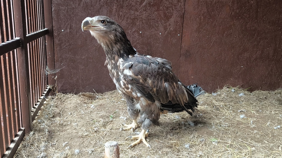 Это птица со старой травмой крыла, у людей она жила уже довольно долгое время. Василиса - изначально жертва браконьерства. В птицу стреляли, две пули так и остались в теле. Напоминаем, что белохвосты внесены в Красную книгу РФ, и причинение им вреда влечет уголовную ответственность. К сожалению, местные ветеринарные врачи не смогли провести грамотную операцию - была попытка поставить спицу, но крыло так и осталось изуродованным. Про полет и говорить нет смысла - крыло волочится по земле, постоянно травмируясь и причиняя птице боль. При ходьбе Василиса задевает его лапой и травмирует еще больше. В данный момент орлан живет в карантинном вольере и проходит терапию. При хорошем раскладе примерно через месяц можно будет провести операцию. К сожалению, сохранить конечность не получится - только ампутировать крыло выше полученной травмы. Дополнительно все осложняется плачевным состоянием сердечно-сосудистой системы. Есть риск того, что птица не перенесет операцию, но оставить все как есть