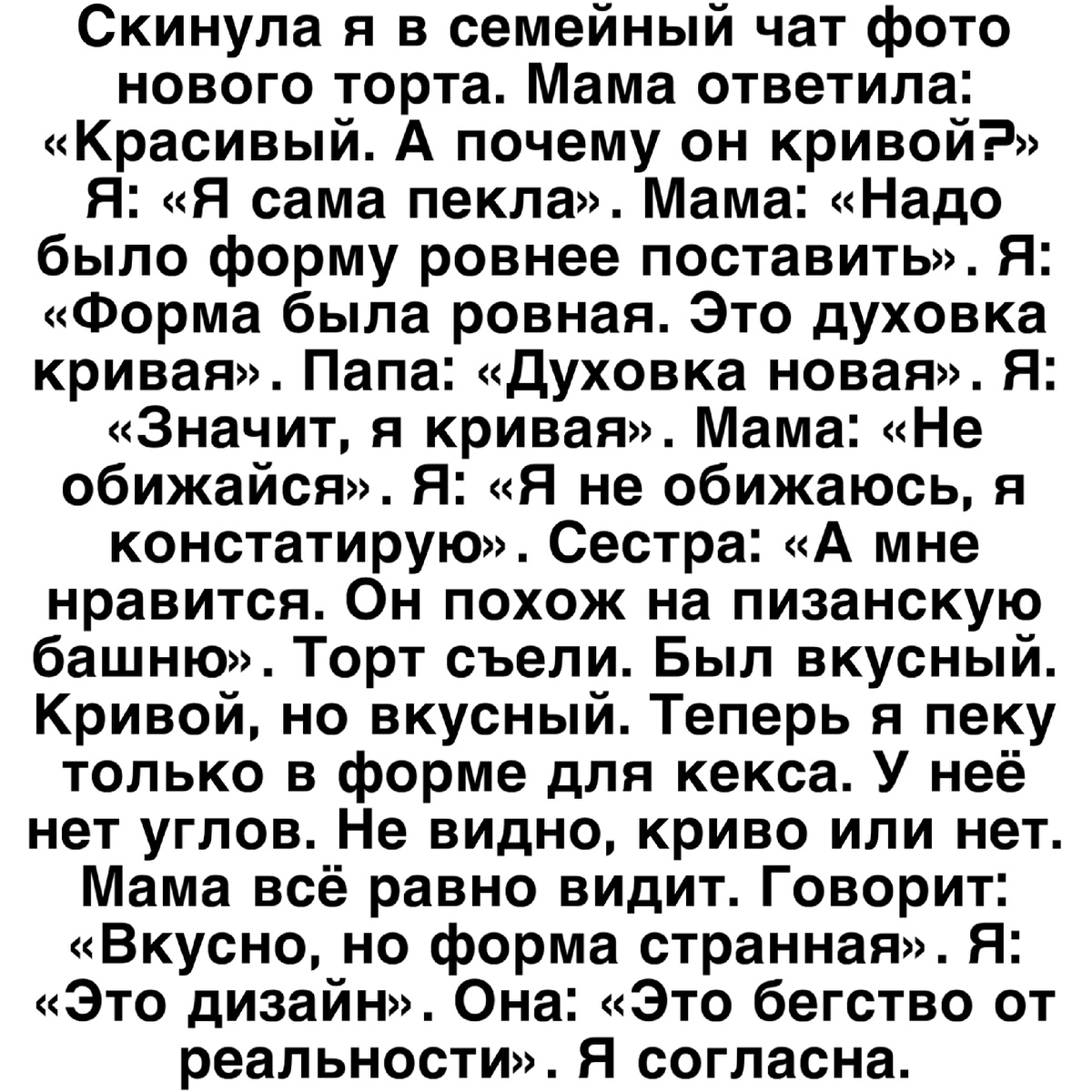 Скинула я в семейный чат фото нового торта. Мама ответила: «Красивый. А почему он кривой?» Я: «Я сама пекла». Мама: «Надо было форму ровнее поставить». Я: «Форма была ровная. Это духовка кривая». Папа: «Духовка новая». Я: «Значит, я кривая». Мама: «Не обижайся». Я: «Я не обижаюсь, я констатирую». Сестра: «А мне нравится. Он похож на пизанскую башню». Торт съели. Был вкусный. Кривой, но вкусный. Теперь я пеку только в форме для кекса. У неё нет углов. Не видно, криво или нет. Мама всё равно видит. Говорит: «Вкусно, но форма странная». Я: «Это дизайн». Она: «Это бегство от реальности». Я согласна.