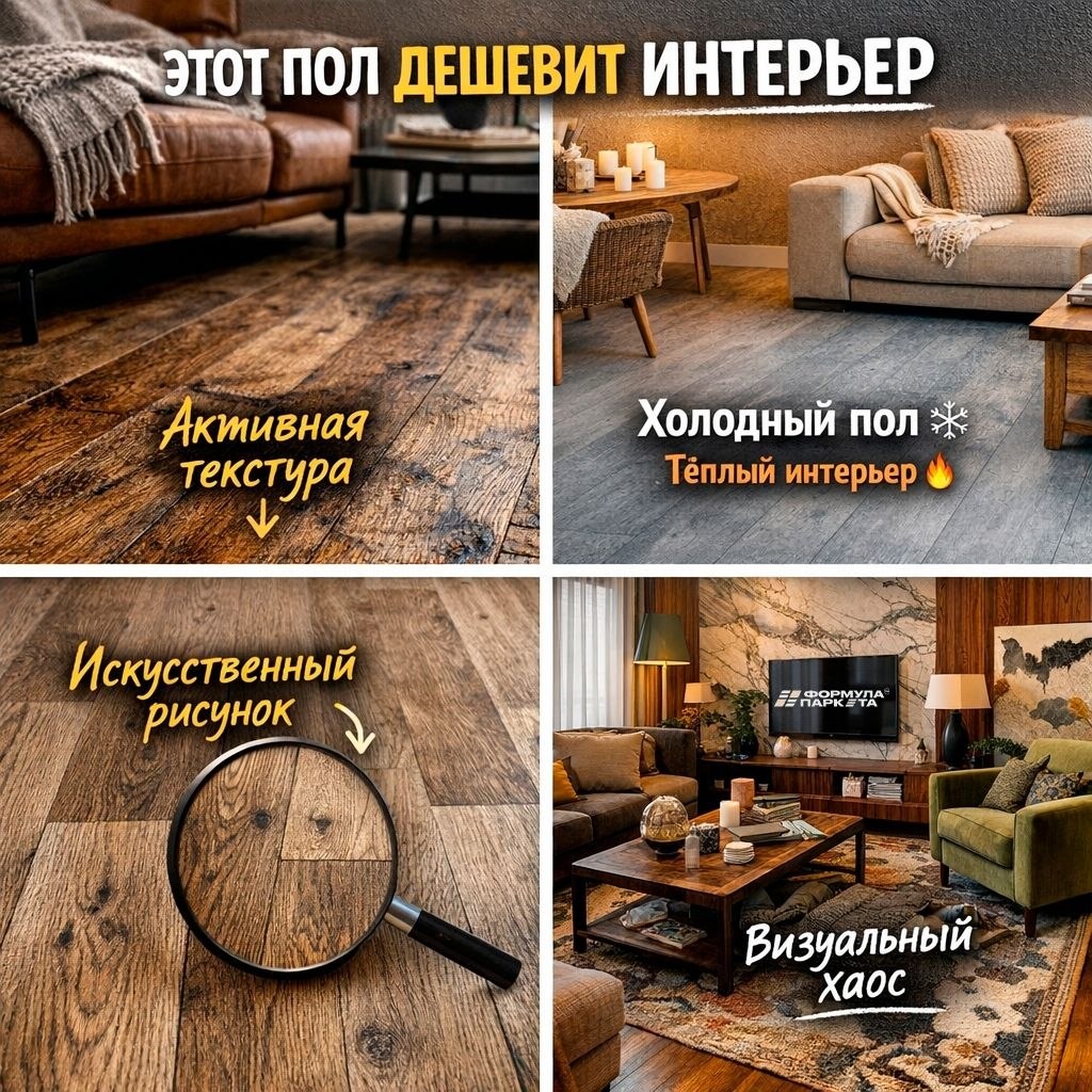 Даже если он дорогой Иногда проблема не в цене. А в том, как материал выглядит в пространстве. Пример 1 Активная «деревянная» текстура с контрастными прожилками → перетягивает всё внимание на себя → интерьер начинает выглядеть шумно Пример 2 Серый холодный пол в тёплом интерьере → конфликт температур → ощущение «не собралось» Пример 3 Слишком мелкий или «дешёвый» рисунок → визуально упрощает всё пространство → даже дорогая мебель не спасает Почему так происходит Пол — это самая большая поверхность в интерьере. Если он «кричит» или не попадает в тон — он ломает всё. 👉 Если сомневаешься: лучше спокойный, нейтральный пол, чем «эффектный» с риском