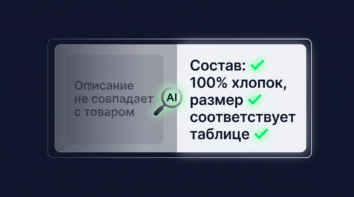 Несоответствие ожиданий и реальности. Одна из главных причин возвратов и низких оценок — разрыв между тем, что покупатель увидел на карточке, и тем, что он получил. AI анализирует формулировки отзывов и выявляет, где именно описание или фото создаёт завышенные или неверные ожидания. «Цвет на фото совсем другой», «ткань выглядит лучше, чем на самом деле», «в описании написано одно, а на этикетке другое» — это не просто эмоции, это сигналы к правке конкретных элементов карточки.