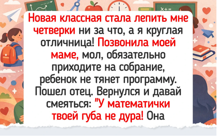 - Новая классная стала лепить мне четверки ни за что, а я круглая отличница! Позвонила моей маме, мол, обязательно приходите на собрание, ребенок не тянет программу. Пошел отец. Вернулся и давай смеяться: «У математички твоей губа не дура! Она, оказывается, теперь ведет дополнительные занятия после уроков. За определенную сумму, естественно, вот и „набирает“ себе так учеников. Ну я сказал, пусть ходит, конечно, но раз все так серьезно, давайте девочку в обычный класс переведем тогда. Зачем ей математический класс? Пойду с директором разговаривать». Она как-то быстро съехала, промямлив что-то про факультативные задания. С тех пор она перестала меня специально валить, оценивала по существу. @ ADME