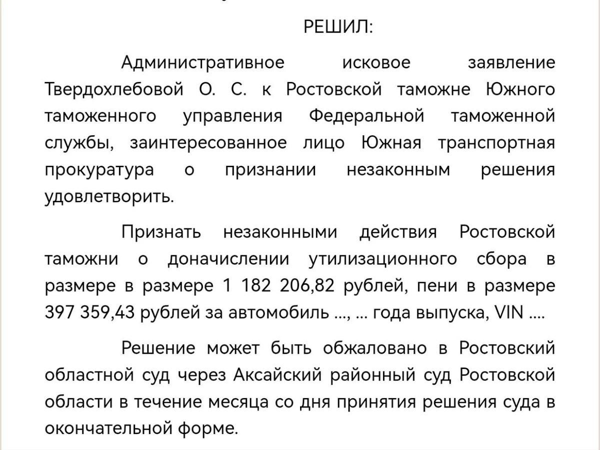 Ростовская таможня задним числом доначислила ей 1,18 млн руб. сбора и 397 тыс. руб. пени, посчитав, что расчёт должен был проводиться по «компенсационной формуле» с учётом таможенных пошлин.