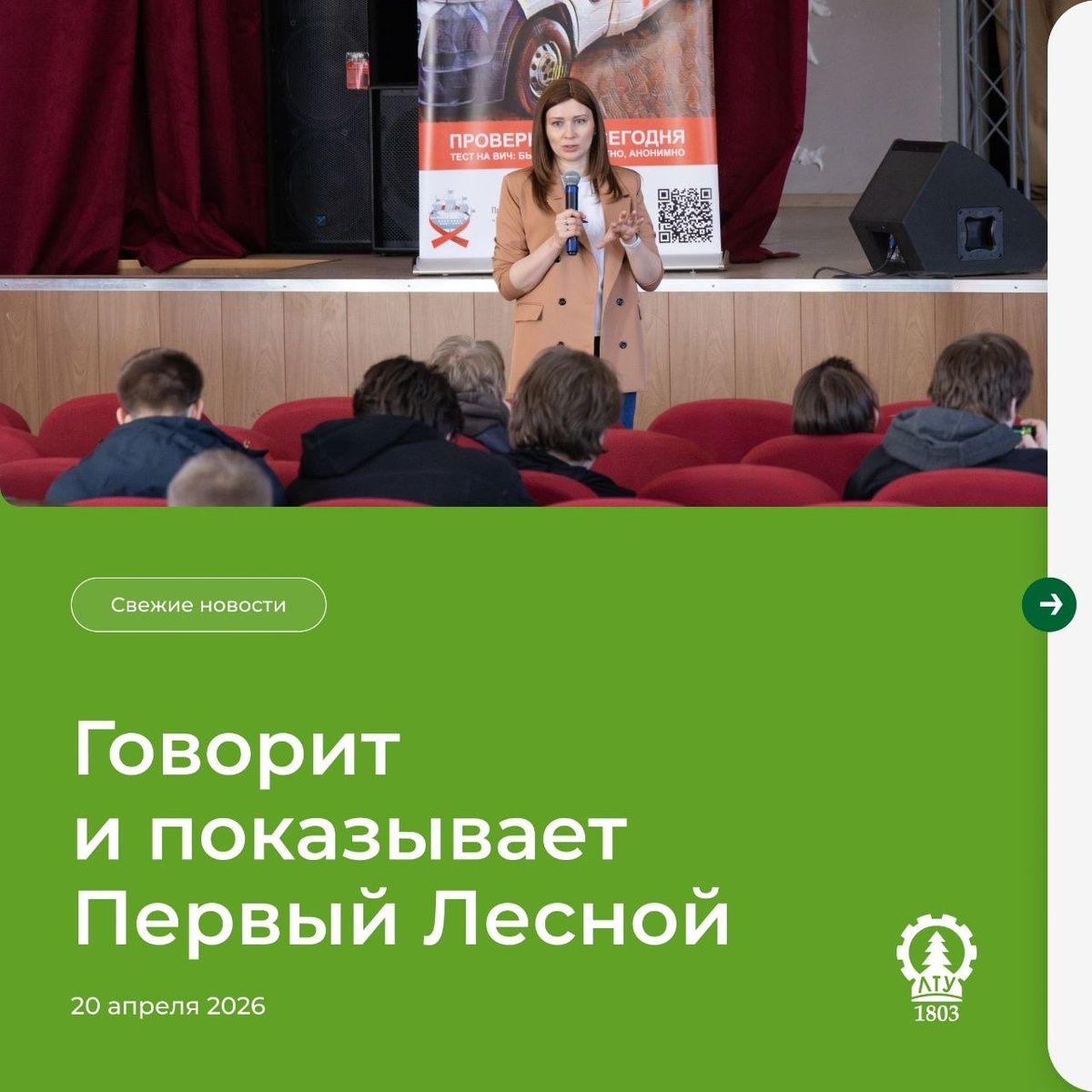 Собрали главные новости для вас 👇 ❤️ Семинар «Противодействие распространению ВИЧ и СПИД» — 16 апреля в рамках программы «Чистое Поколение» выступила медицинский психолог Центра СПИД Марина Константиновна Григас. Студенты смогли пройти экспресс-тестирование в мобильной лаборатории. Подробнее — на сайте СПбГЛТУ 🐱 Итоги фестиваля «КО-Творчество» — кафедра КМиКГ подвела итоги конкурса. В номинации «Без кота жизнь не та» выбрали лучшие работы. Подробности — в МАХ 🌸 Проллеска желает продуктивной пятницы — Scilla в Ботаническом саду напоминает: красота вокруг нас даже в будни. Подробности — в МАХ Следите за новостями Первого Лесного 💚
