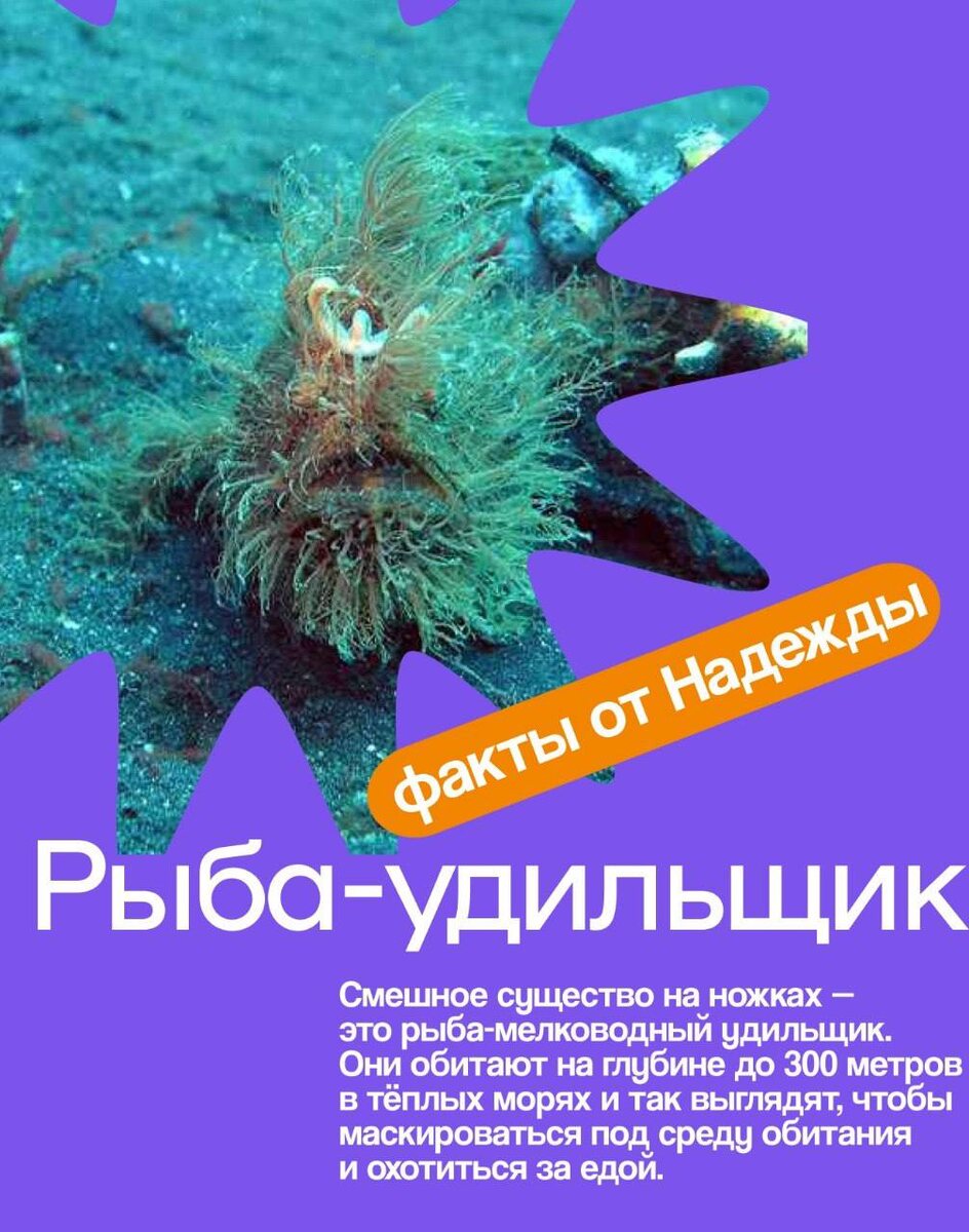 Попросили Надежду Потапову — биолога, биоинформатика, психолога помочь нам собрать самые необычные. Будет много странного, неожиданного и даже немного шокирующего 👀 На очереди удивительное существо — рыба-мелководный удильщик. 📌Листай карточки и выбирай любимый факт. #лучшечем_факт
