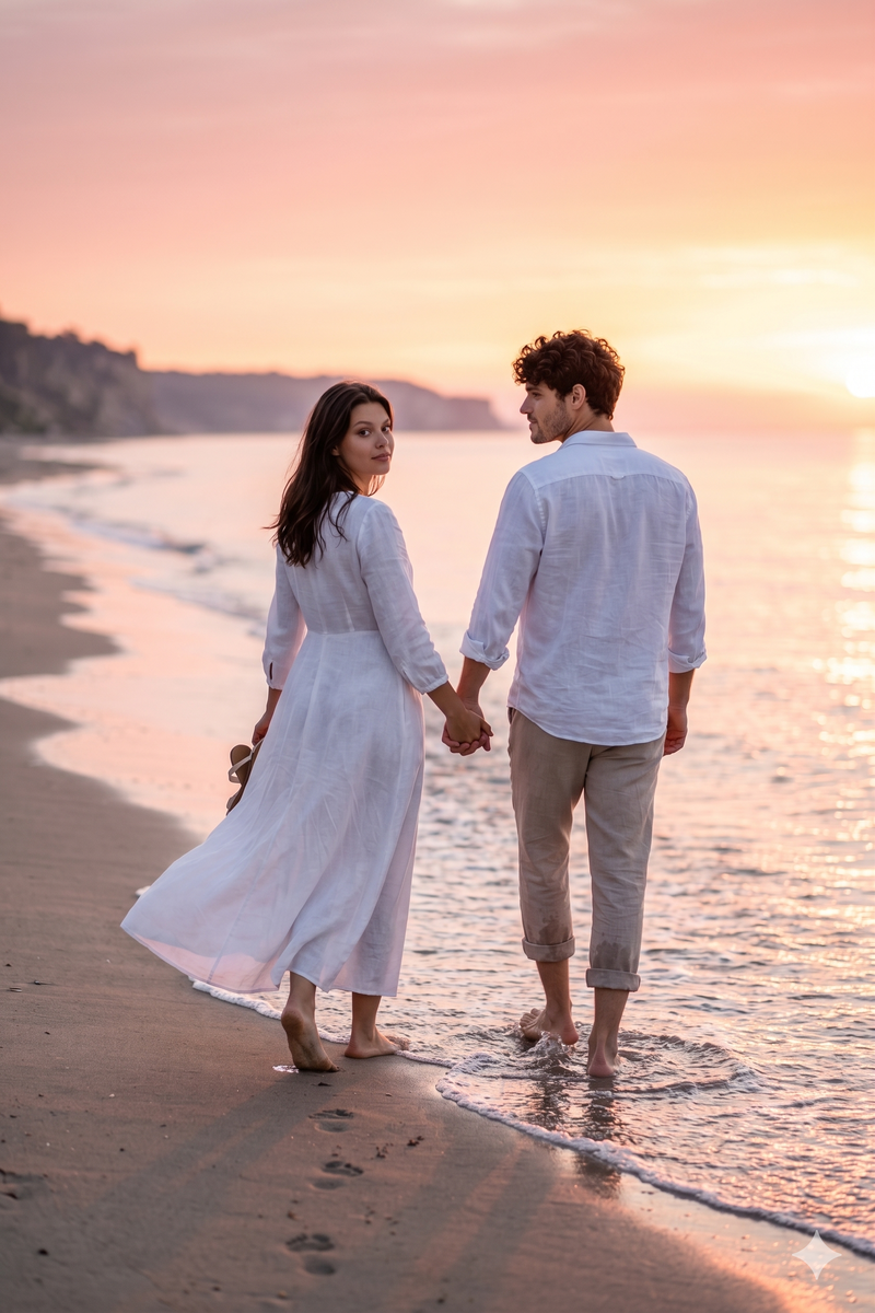 5️⃣ Промпт 5: На берегу моря на рассвете босиком (девушка + парень)