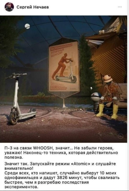 Майор Нечаев из Atomic Heart устроил раздачу — десяти рандомным Нечаевым подарят по 3826 минут на самокаты Whoosh