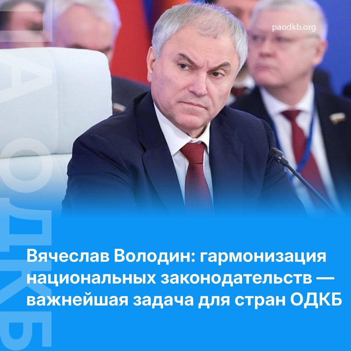 Ассамблеи ОДКБ. «Главная задача Парламентской Ассамблеи ОДКБ — сближение и гармонизация национальных законодательств. Прежде всего в сфере безопасности. Решения в этой области должны отвечать требованиям времени, способствовать противодействию вызовам и угрозам», — подчеркнул Вячеслав Володин. ✅Как отметил спикер, в год председательства России в ОДКБ по предложению Президента РФ Владимира Путина запланирован экспертный форум, посвященный вопросам коллективной безопасности. 📎По словам Председателя ГД, парламентарии также смогут принять в нем участие. ✅Закрепление на законодательном уровне договоренностей, достигнутых главами государств-членов ОДКБ, — одна из приоритетных задач в работе Парламентской Ассамблеи Организации, подчеркнул Вячеслав Володин. 📋Он также напомнил, что в 2026 году ПА ОДКБ отметит юбилей — 20 лет со дня образования. «Это для нас возможность подвести итоги, наметить цели на будущее, проанализировать формы работы и структуру Организации. Правильно будет обсуди