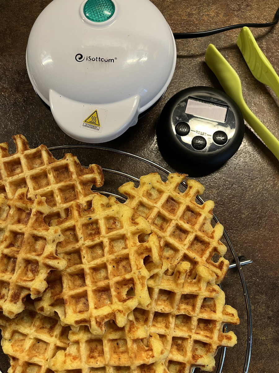 О маленькой игрушке, которую завела себе больше на потеху . я уже рассказывала. Вот она, миниатюрная вафельница диаметром 10 см и с единственной функцией - включить и нагреть. Больше не единой опции или вариативности. А оно мне и надо, тем более в выходные с помощницей - внучкой. Выпекается быстро - это плюс, нагревается крышка - это минус. Приходится орудовать щипчиками, прихватками или привыкшими к горячему - пальцами. Рецепты, которые предлагаются в инструкции - полный отстой. На 1 яйцо стакан муки? это ж слипнется, пардон. Обращение к подругам - кондитерам и "гуглу" с дальнейшими собственноручными корректировками рецептов привело к вкусным рецептам. Сразу оговорюсь - я не планирую готовить вафли сладкие, мне интересны рецепты десертных закусочных несладких. В чем прелесть такой вафельницы и готовке в ней? можно играться и конструировать по своему вкусу. Все намешать в миску, попробовать испечь первую вафлю. Жидковата? добавьте муку (желательно рисовую, кукурузную или какую люб