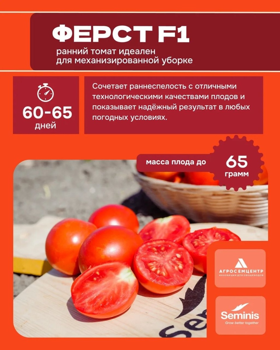! 🌟 Хотите быть первым на рынке со свежими томатами? 🚀 Тогда, вам срочно надо бежать к нам за семенами гибрида томата «Ферст»! 🏃♂️Томат Ферст F1 открывает сезон сбора урожая одним из первых. 🌞 Один из лучших гибридов открытого грунта, который идеален для употребления в свежем виде, в салатах и для переработки. 🥗Уже через 60–65 дней после высадки рассады вы получите обильный, дружный и качественный урожай раньше конкурентов! ⏰ Идеальные плоды округлые, плотные, массой 60–65 г, однородные по размеру. Не растрескиваются! 🍅 Компактное и удобное растение: детерминантный куст не требует сложного формирования, хорошо укрывает плоды от солнца и подходит для механизированной уборки. 🌱 Высокое качество и стабильная урожайность: Гибрид сочетает раннеспелость с отличными технологическими качествами плодов и показывает надёжный результат в любых погодных условиях. ☀️🌧️ Гарантия качества: оригинальные семена компании «Агросемцентр» - это ваша уверенность в высокой всхожести и соответс