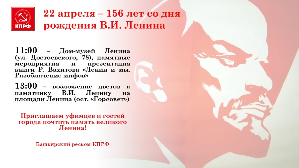 22 апреля 2026 года исполняется 156 лет со дня рождения Владимира Ильича Ленина. Башкирский реском КПРФ приглашает уфимцев и гостей города почтить память основателя первого в мире социалистического государства. В программе: 11:00 - Памятное мероприятие в Доме-музее Ленина (ул. Достоевского, 78). Ключевое событие - презентация книги уфимского философа Рустема Вахитова «Ленин и мы. Разоблачение мифов», изданной в 2025 году в Москве в редакции Захара Прилепина. 13:00 — Возложение цветов к памятнику В.И. Ленину на площади Ленина (остановка «Горсовет»). В мероприятии примут участие представители КПРФ, депутаты, деятели культуры, ученые, педагоги, писатели, журналисты, школьники и студенты. Приглашаются все желающие.