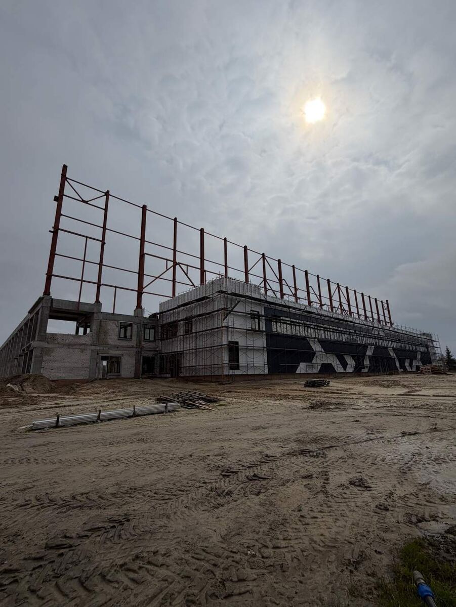 На данный момент полностью готовы конструкции двухэтажного административно-бытового блока, а также монолитные железобетонные колонны и балки самого манежа. Окна уже частично вставлены. Сейчас строители заняты монтажом навесного фасада.