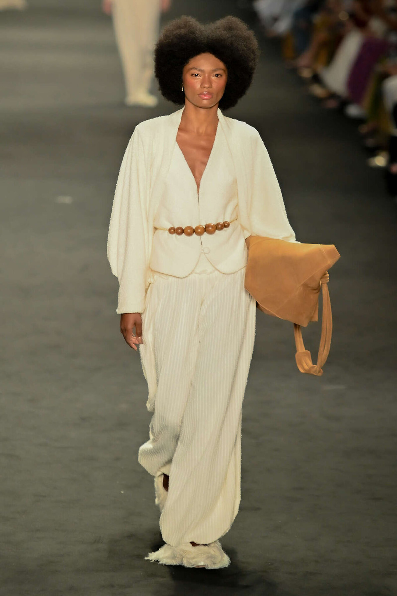 Есть коллекции, которые показывают одежду. А есть те, которые передают состояние. Aluf весна–лето 2027 «Diálogos sobre o Tempo» — как раз из таких. Эта коллекция говорит о времени не через сложные слова, а через настроение, цвет, движение ткани и детали. Здесь все построено на ощущении красивого замедления. Молочные, песочные, карамельные и черные оттенки, мягкие силуэты, струящиеся ткани, круглые сумки, украшения и пояса с отсылкой к циферблату — все это собирается в спокойную и цельную историю. При этом коллекция не выглядит слишком далекой от жизни. В ней есть вещи, которые легко представить и вне подиума: свободные брюки, жилеты, мягкие блузы, расслабленные костюмы, сатиновые платья и выразительные аксессуары. Именно поэтому показ смотрится не только красиво, но и понятно. Светлые выходы здесь звучат тихо и мягко, черные — глубже и строже. За счет этого коллекция держит внимание, но не давит. В ней есть элегантность, которая не кричит, а просто остается в памяти. Если коротко, Aluf
