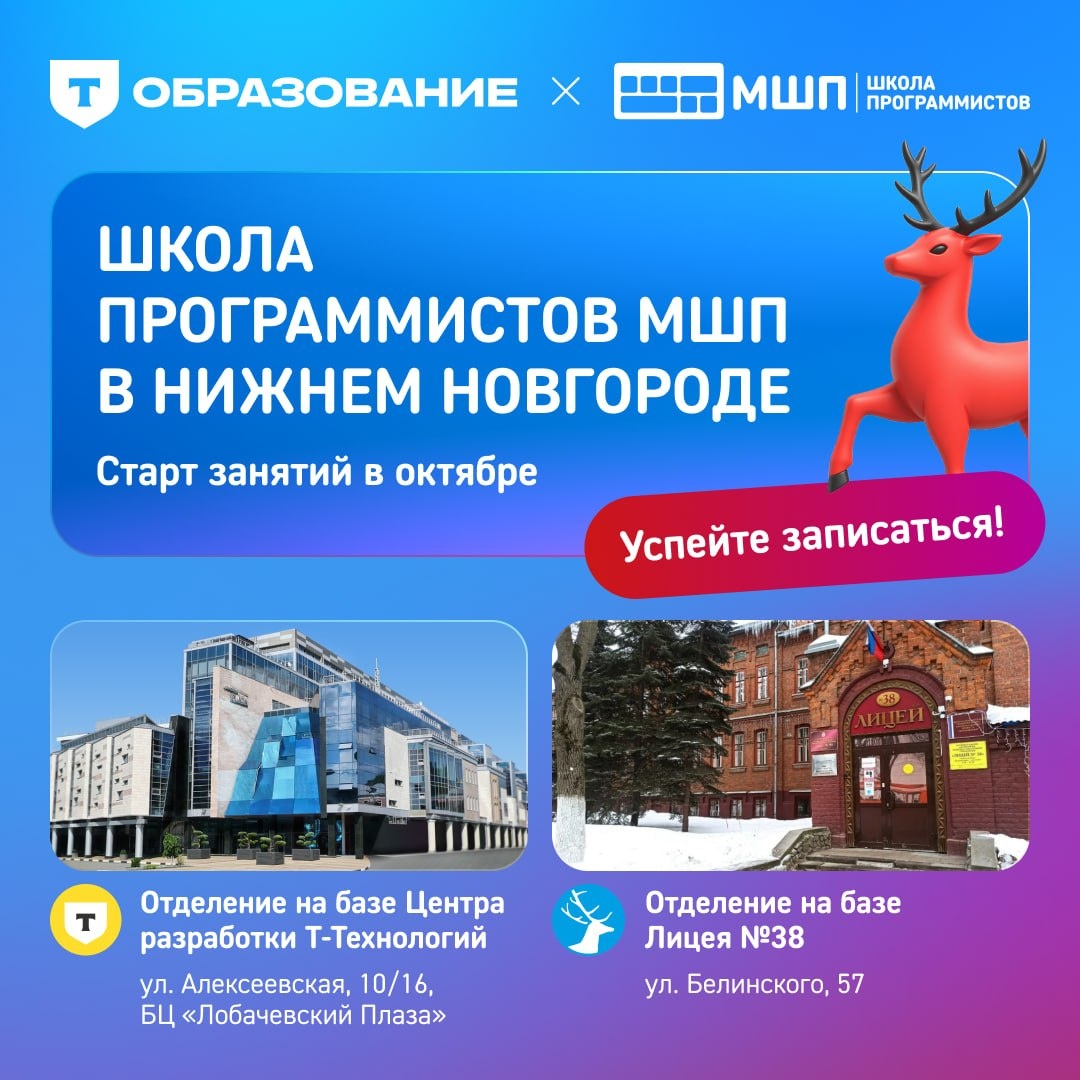 Школа программистов МШП совместно с Т-Образованием приходит в Нижний Новгород с двумя отделениями в самом сердце города и полной образовательной траекторией! ❓ А вы знали, что в 2025 году в Нижнем Новгороде 13% участников, или каждый восьмой экзаменуемый, сдавал ЕГЭ по информатике! Именно поэтому в Нижнем Новгороде мы сразу запускаем полную образовательную модель МШП: ✔️ непрерывную программу с 3 по 10 класс, где формируется мышление, математическая база, навыки программирования и работы с ИИ 💡 и усложнённую траекторию для старших учеников, готовых к более высокой нагрузке и проектной работе 📍 Отделение на базе Лицея №38 Первое отделение МШП с фундаментальной программой для школьников 3-10 классов в Нижнем Новгороде располагается в ведущей школе города — Лицее №38, известном своей сильной олимпиадной подготовкой! Здесь мы создаём комфортную и эффективную среду для обучения и помогаем ученикам выстроить прочный технический фундамент и системное мышление в сильной академической с