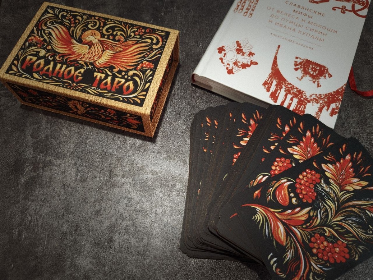 Помните, я тут обещала показать колоду? и....НЕ ПОКАЗЫВАЮ. Как думаете, почему? 😄 Тут должен быть мем, что я долго не могла "ворваться в кейс", а у меня особое отношение с колодами в кейсах, я их вечно НОРОВЛЮ СЛОМАТЬ. Ну а вообще потому что я такая: "сейчас быстренько посмотрю"… и через какое-то время очнулась с книгой по СЛАВЯНСКОЙ МИФОЛОГИИ. ЧИТАЮ. ВНИКАЮ. ЗАНАВЕС. 😱 Изначально я рассчитывала на качественного и красивого дублёра Уэйта в эстетике русской деревни, а потом рассматриваю изображения на картах и ловлю себя на "А ПОЧЕМУ ТАК? НУ-КА, ДАВАЙТЕ ПОДУМАЕМ" И тебя при этом не отталкивает, а наоборот, затягивает. 🌅 Первое, что прям зацепило - Высший Суд. Никаких труб, никаких "восстаньте", никакого пришествия, а по-русски: люди лезут в прорубь. И ты такой: ну да… вот это я понимаю. Можно вообще не чувствовать всю эту религиозную историю, а вот этот сюжет - он понятен сразу. И аркан внезапно про "ИДИ И СДЕЛАЙ, ЕСЛИ ХОЧЕШЬ ПЕРЕЙТИ НА НОВЫЙ УРОВЕНЬ" Причем, ну, через что-то так