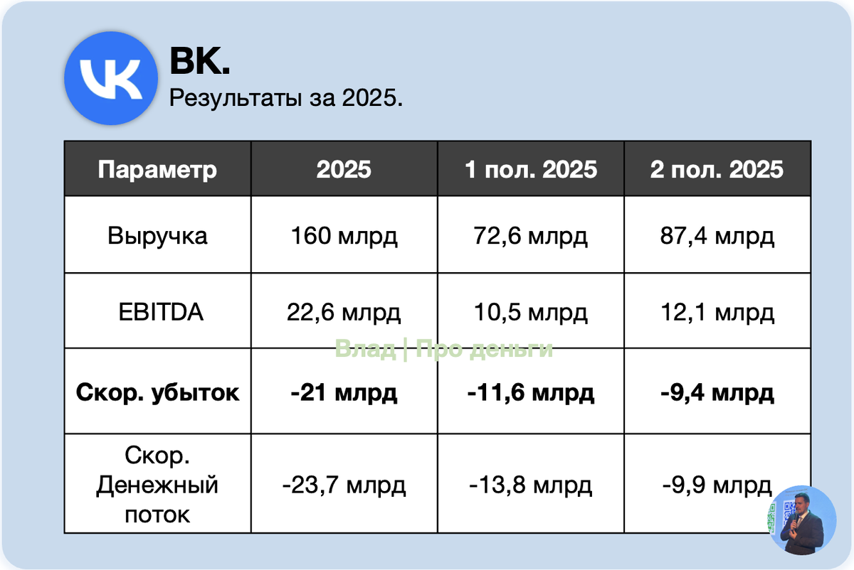 Пока есть затишье между сезонами отчетности за весь 2025 год и 1 кв. 2026 года, анализирую отчеты компаний, которые пока не покрывал, и тех, кто не блистал результатами в прошлом. ВК — компания из второй группы. Разбираю ее отчет за 2025 год для вас. ❌ Выручка 2025 = 160 млрд руб. (+8,4% г/г)