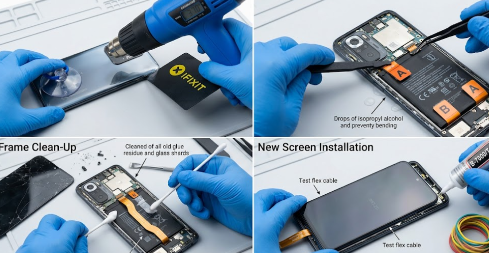 💔 Шаг 5: Демонтаж поврежденного дисплея и зачистка посадочного места