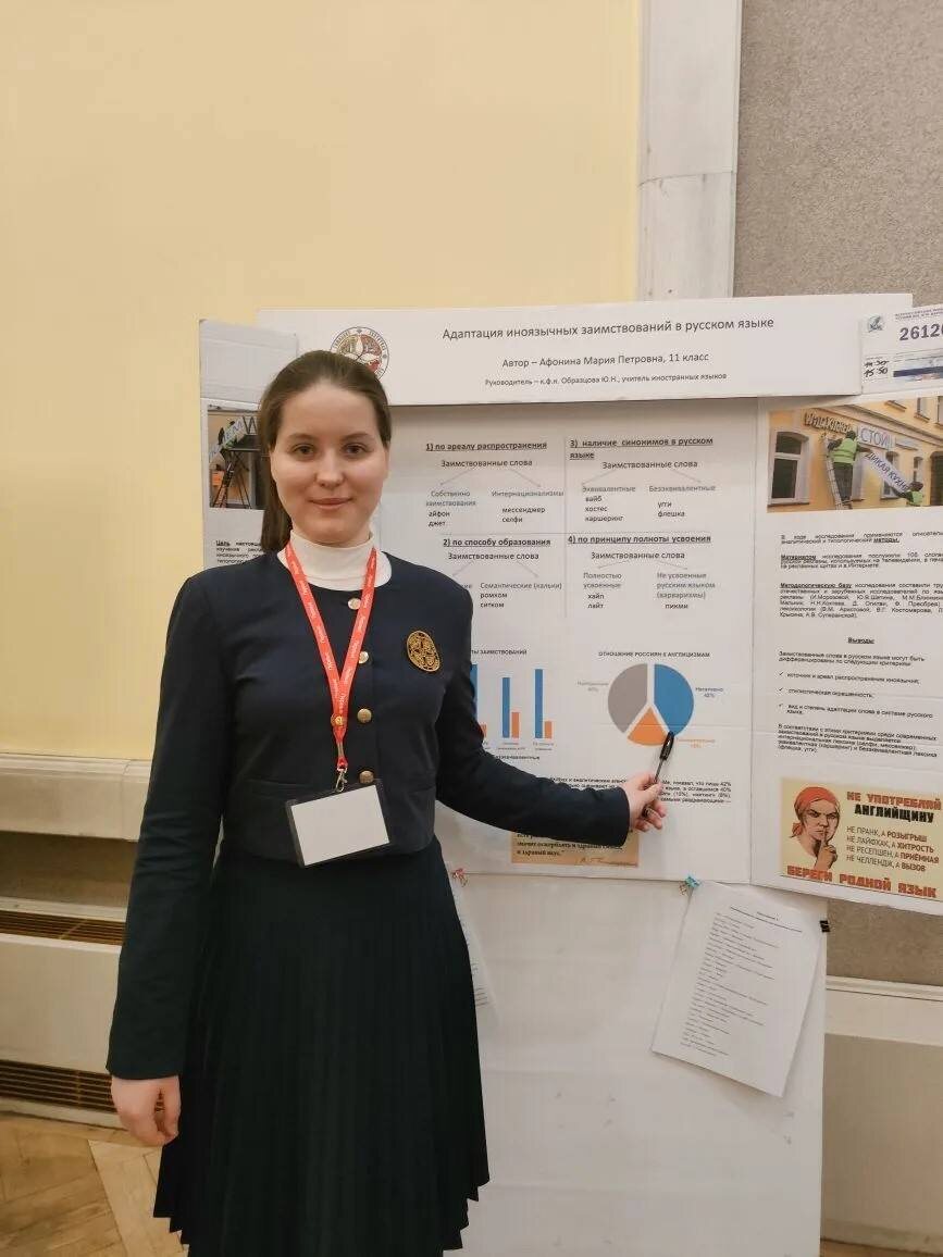 И. Вернадского Ученица 11 класса Мария Афонина стала победителем XXXIII Всероссийских юношеских чтений имени В.И. Вернадского. Под руководством учителя иностранного языка Юлии Николаевны Образцовой Мария представила работу «Адаптация иноязычных заимствований в русском языке». Мероприятие проходило в течение недели, а стендовая сессия состоялась в здании Президиума Российской академии наук. По итогам защиты исследовательской работы Мария удостоена диплома I степени. Всероссийские чтения имени В. И. Вернадского направлены на развитие интеллектуального и личностного потенциала учащихся, вовлечённых в исследовательскую деятельность, а также на приобщение молодёжи к традициям российской научной школы. Особое значение конкурс имеет в контексте наследия Владимира Ивановича Вернадского — выдающегося учёного, создателя учения о ноосфере. Поздравляем Марию с высоким результатом и желаем дальнейших успехов в научной деятельности!
