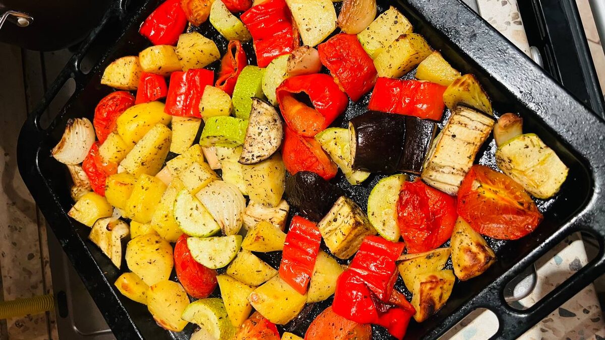 Есть у меня такая присказка: если нечего смотреть - включай «Каменскую» или «Голодные игры». Ну, в смысле, когда ты не понимаешь, чего хочешь. Вот с едой у меня так же. Когда не знаю, что приготовить, я либо делаю окрошку, либо запекаю овощи. Говорят, у запечённых овощей гликемический индекс ниже. Что бы это ни значило. Наверное, просто можно чувствовать себя чуть спокойнее. Главное - не съесть весь противень. В топе у меня всегда: — кабачок — баклажан — помидоры (подойдут даже самые обычные) — болгарский перец или сладкий перец Рамиро — лук — чеснок (без него вообще не то) Можно добавить картошку. Можно морковь. Можно брокколи. Кто я такая, чтобы вам запрещать. Сразу на противень. Оливковое масло. Соль, перец. Итальянские травы - по желанию. И обязательно перемешать руками. Вот тут начинается магия. Когда ты трогаешь еду руками, ты как будто заземляешься. Масло, специи, текстура - и мысли становятся тише. Духовка 190–200 градусов. В один слой. Вариант 1: 30–40 минут под фольгой, потом