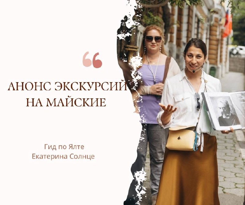 ! 🌷Дорогие экскурсанты! С радостью сообщаю вам, что теперь билеты на групповые экскурсии можно приобрести на сайте! В ЛИЧНЫЕ СООБЩЕНИЯ ИЛИ КОММЕНТАРИИ писать для бронирования не нужно. В течение суток после оплаты вам на указанную вами почту придет подробная организационная информация. Если вдруг не пришла в течение суток, напишите мне в личные сообщения. 📍1 мая пт 12.00 - экскурсия по имению «Харакс» (Гаспра). Подробности и билеты тут. 📍2 мая сб 12.00 - экскурсия по нетуристической Ялте моей коллеги Екатерины Матешко "Тайны Чайной горки" (ул. Коммунаров, Щербака, Сеченова). Подробности и билеты тут. 📍3 мая вс 12.00 - экскурсия по нетуристической Ялте "Сценарии жизни". Подробности и билеты тут. 📍6 мая среда 12.00 - тематическая экскурсия по Ялте "Ялта гастрономическая" (ул. Рузвельта, Карла Маркса, Набережная). Подробности и билеты тут. 📍10 мая вс 12.00 - экскурсия по Ялте «Променад по Чехова». Подробности и билеты тут. Все экскурсии пешеходные и к началу маршрута вы доб