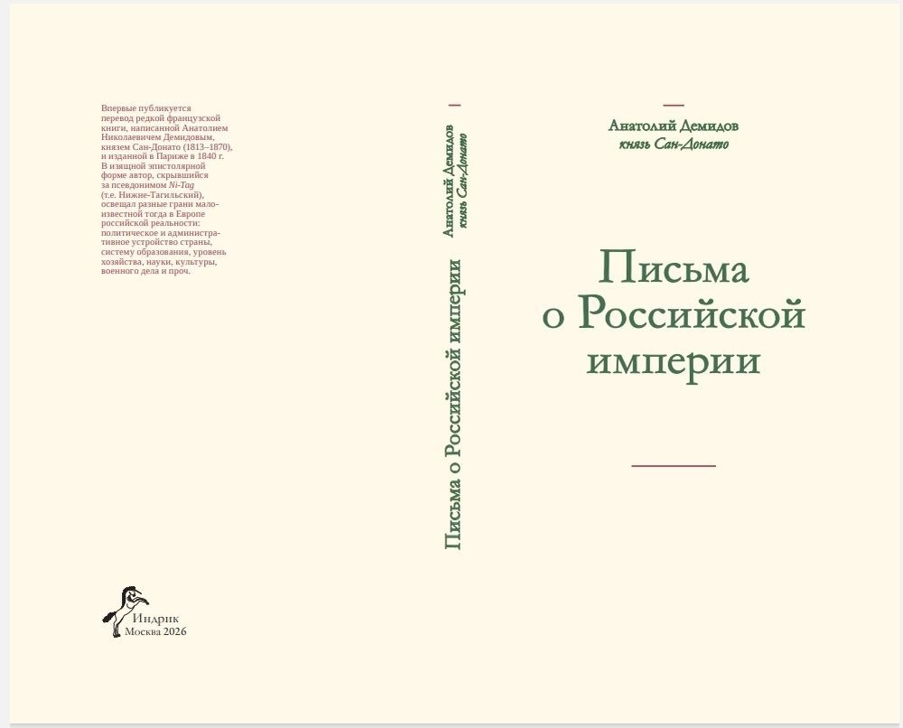 интереснейший томик Анатолия Николаевича Демидова. Представитель легендарной тульско-сибирской династии, Анатолий Демидов жил преимущественно между Францией и Италией, где получил титул князя Сан-Донато, не признанный, впрочем, императором Николаем I. Оставаясь русским, он по зову своего сердца делал многое для сохранения связей с Родиной. После организованной им титанической научной экспедиции по Югу России и Крыму — см. книгу 'Путешествие в Южную Россию и Крым в 1837 году' — он задумал познакомить европейцев с современной Россией. В 1840 году в Париже А.Н. Демидов издал свой труд, озаглавив его: «Письма о Россииской империи». До настоящего времени эта книга ни разу не выходила на русском языке. В изящной форме посланий к воображаемому корреспонденту автор, скрывшийся за псевдонимом Ni-Tag (т.е. Нижне-Тагильский), освещал разные грани малоизвестной тогда в Европе российской реальности: политическое и административное устройство страны, систему образования, уровень хозяиства, науки,