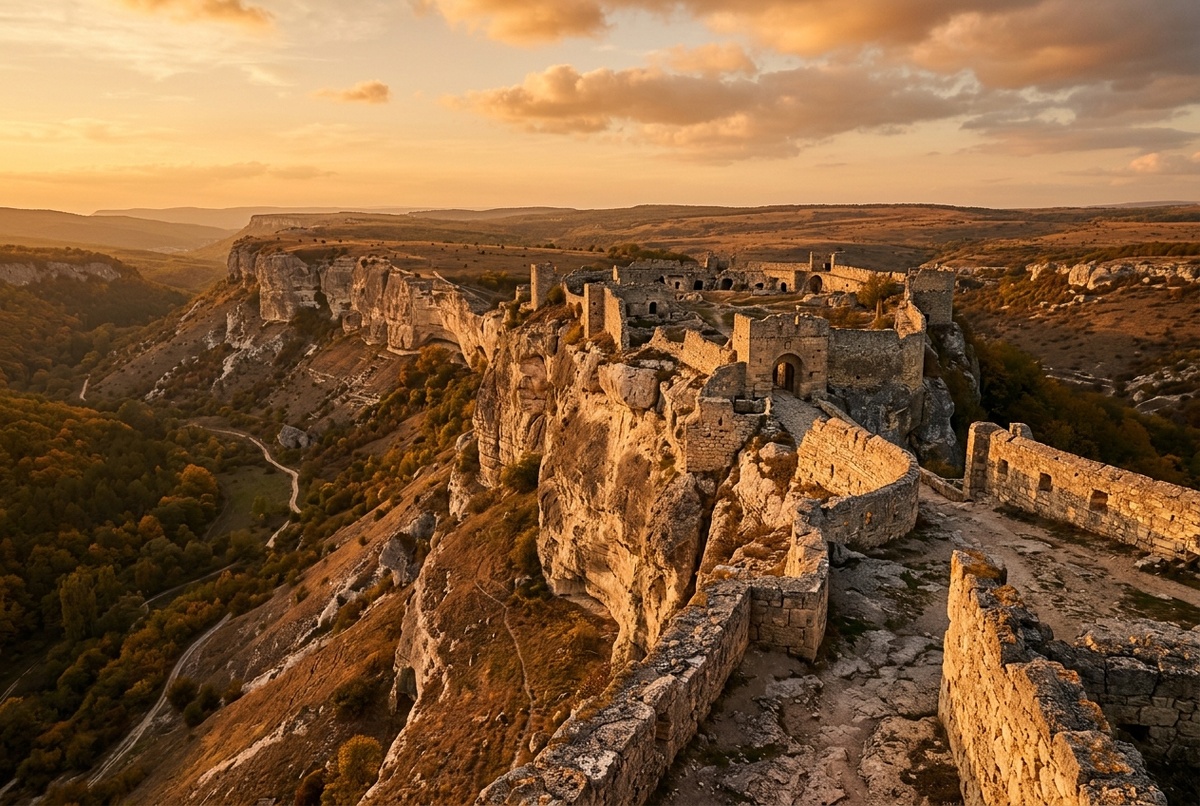 Плато стоит над Бахчисараем так, будто его подняли над городом на ладони. Отметка 558 метров, обрывы с трёх сторон почти вертикальные, четвёртая сторона закрыта стеной, сложенной из того же известняка, что и скала. Сверху видно, как внизу петляет Ашлама-Дере, и понятно, почему здесь держали крепость тысячу лет: поднять конницу сюда нельзя, осадить можно, но штурмовать почти невозможно.