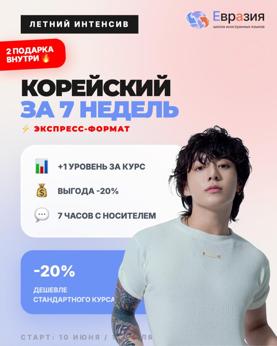 ! Обычно освоение уровня с нуля занимает 4 месяца. Мы решили, что этим летом вы достойны большего и разработали программу, оставив только самую суть, пользу и драйв. Представляем Летний ЭКСПРЕСС-курс корейского — ваш самый быстрый путь от «ничего не понимаю» до уверенных диалогов. 1️⃣ Скорость х2: Вы проходите полную программу уровня A1/TOPIK 1 не за 16 недель, а всего за 7 недель. Никакой воды — только то, что реально нужно для общения. 2️⃣ Цена на 20% ниже: Мы снизили стоимость специально для летнего набора. Ваша экономия составит более 8 000 ₽ по сравнению с обычным форматом. 3️⃣ Погружение 24/7: Занятия 2 раза в неделю по 2 часа 15 минут — идеальный ритм, чтобы мозг начал «думать» по-корейски, не успевая забывать пройденное. Что внутри? ➡️ 14 мощных уроков онлайн в мини-группах. ➡️ 7 часов чистой разговорной практики с носителями языка. ➡️ Полный доступ к платформе с тренажерами и видео. ➡️ Сертификат гособразца по окончании обучения. 🎁 БОНУС ЗА СКОРОСТЬ При оплате до 30 апр