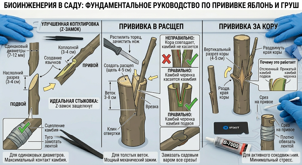В этом масштабном руководстве мы препарируем процесс прививки семечковых культур (яблони и груши). Мы разберем клеточную анатомию тканей, протоколы совместимости видов, физику срезов и алгоритмы хирургического вмешательства, чтобы вы смогли провести эту операцию со 100% приживаемостью.