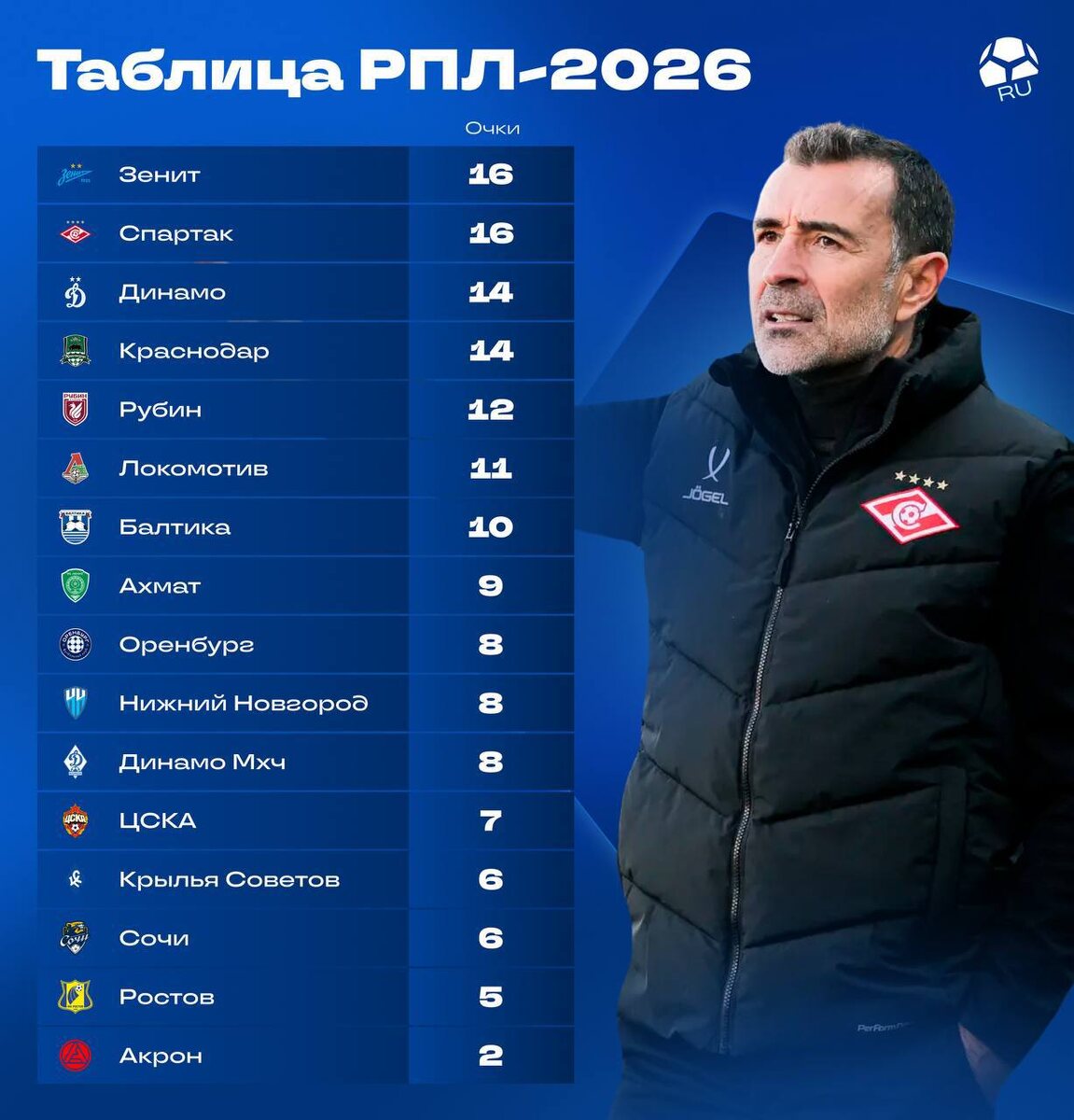 Таблица после рестарта РПЛ. По 16 очков весной набрали лишь 2 команды – «Спартак» и «Зенит» (Питер выше из-за победы в очном матче). Рубин» – в топ-5. ЦСКА лишь на 12 месте с 7 очками в 7 играх. «Акрон» – с отрывом худшая команда в новом году. @myach | МЯЧ RU в МАХ