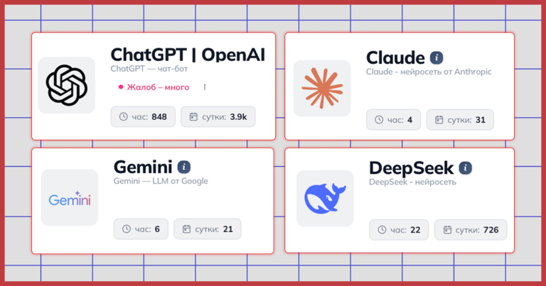 Как сообщают пользователи соцсетей и сервисы мониторинга интернет-перебоев, шатдаун затронул сразу три популярнейших ИИ-сервиса: ChatGPT от Open AI, нейросети Claude и Gemini. Причем все они не открываются или почти не открываются для клиентов не только из России, но и из других стран, в том числе европейских. Например, как свидетельствует портал Downdetector, больше всего жалоб на умолкший ChatGPT поступило из Великобритании — более 7,6 тыс. Немногим лучше ситуация в Бельгии, Германии, Испании, США и Франции. О причинах сбоя и вероятных сроках устранения неполадок официально пока ничего не сообщается. Когда-то давным-давно славящиеся интеллектом вполне натуральным предшественники чата джипити заметили: в любой ситуации можно найти позитив. В нынешней его, наверное, даже и искать особо не надо: в кои-то веки от проблем с доступом хоть к чему-нибудь в интернете страдаем не мы одни, а юзеры по всему миру. Фото: скриншот detector404.ru Текст: Кирилл Романов