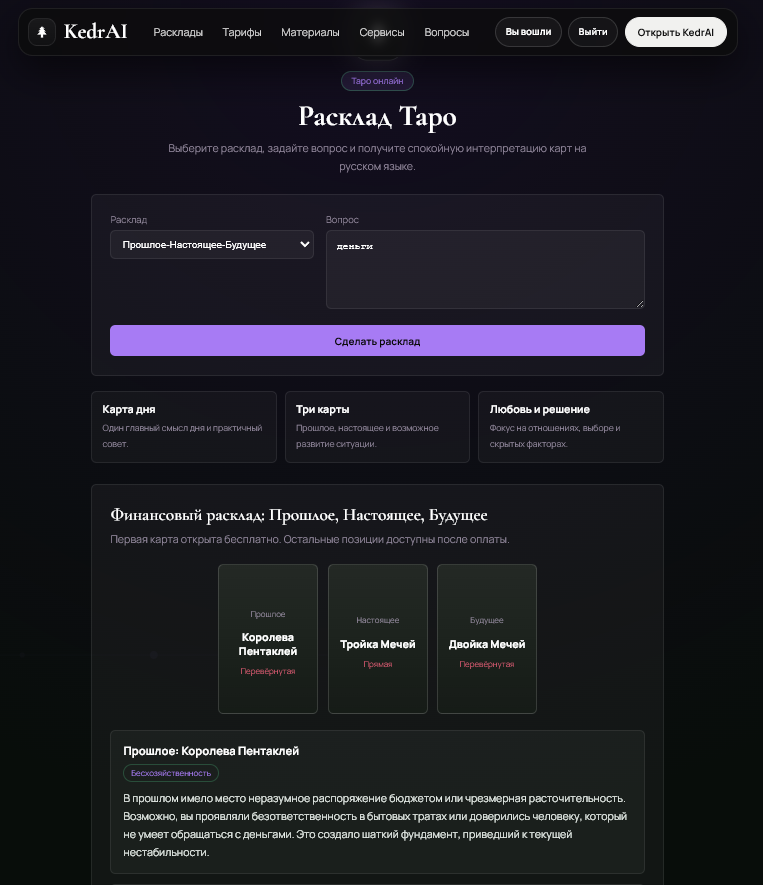 Но однажды в 11 вечера, когда крутил в голове один финансовый вопрос по кругу — просто попробовал. Зашёл на kedrai.ru, выбрал расклад Таро, написал вопрос про деньги. Нажал кнопку. И вот что вышло. Карта потери, нехватки, страха бедности. ИИ написал: «Эта позиция говорит о том, что в основе вашего отношения к деньгам лежит опыт нехватки — реальной или воспринятой. Вы принимаете финансовые решения из страха, а не из уверенности». Я перечитал три раза. Попал в точку — и это было неприятно. Карта новых возможностей, семени, которое можно посадить прямо сейчас. ИИ: «Перед вами открывается реальный финансовый шанс. Вопрос не в том, есть ли возможность — она есть. Вопрос в том, возьмёте ли вы её или снова будете ждать». Стало немного не по себе. Потому что я действительно откладывал одно решение уже два месяца. Карта терпения, долгосрочной работы и оценки результатов. ИИ: «Быстрых денег здесь нет. Но есть устойчивый рост — если вы перестанете бросать на полпути. Эта карта предупреждает: имен