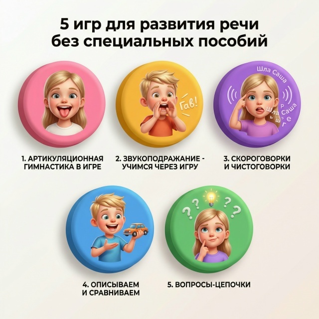 Логопедические пособия, карточки, специальные тетради — всё это полезно. Но речь развивается прежде всего в живом общении и игре. И для этого не нужно ничего покупать или готовить заранее. Вот 5 простых игр, которые можно использовать прямо сейчас — дома, в группе, на прогулке. 1. Артикуляционная гимнастика в игре Стандартные упражнения работают лучше, когда превращаются в историю. Расскажите ребёнку, что язычок сегодня отправляется в путешествие: Всего 5 минут такой «сказки» в день — и артикуляция постепенно становится чётче. Главное — регулярность. 2. Звукоподражание Начните с простого: «Как говорит корова? Как едет машина? Как шумит ветер?» Потом усложняйте: «А как лает большая собака? А маленькая? Громко — тихо, быстро — медленно». Это развивает фонематический слух, силу голоса и интонацию — то есть саму основу правильного звукопроизношения. Работает даже с самыми маленькими детьми — им особенно нравится. 3. Скороговорки и чистоговорки «Са-са-са — вот летит оса», «Шла Саша по шоссе
