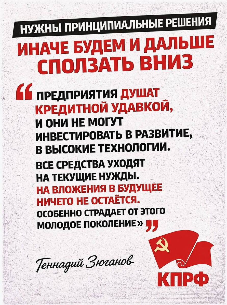 Нужны принципиальные решения. Иначе будем и дальше сползать вниз. Предприятия душат кредитной удавкой, и они не могут инвестировать в развитие, в высокие технологии. Все средства уходят на текущие нужды. На вложения в будущее ничего не остаётся. Особенно страдает от этого молодое поколение.
